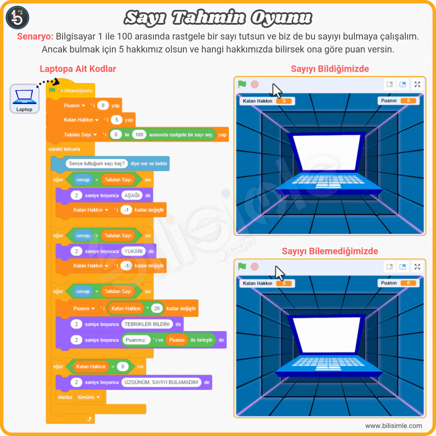 Bu etkinliğimizde Scratch programı ile sayı tahmin oyunu yapacağız. Bilgisayar aklından 1 ile 100 arasında rastgele bir sayı tutacak ve bizim tahminlerimize göre “aşağı” ve “yukarı” şeklinde uyarılar verecek. Ancak her uyarı 1 hakkımızı götürecek ve eğer bilirsek, kalan hakkımıza göre bize puan verecek.